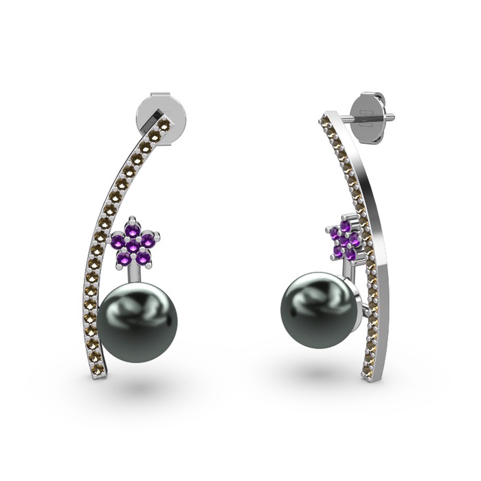 Siyah inci, dumanlı kuvars ve ametist 14 ayar beyaz altın küpe
