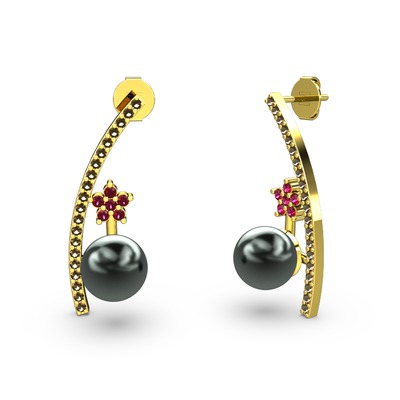 Siyah inci, dumanlı kuvars ve rodolit garnet 925 ayar altın kaplama gümüş küpe