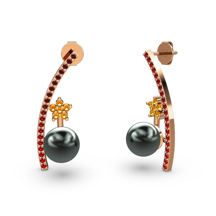 Siyah inci, garnet ve sitrin 18 ayar rose altın küpe