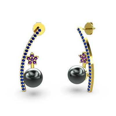 Siyah inci, lab safir ve ametist 18 ayar altın küpe