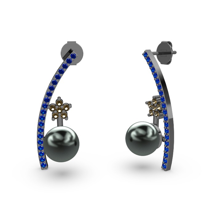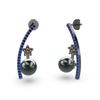 Siyah inci, lab safir ve dumanlı kuvars 925 ayar siyah rodyum kaplama gümüş küpe