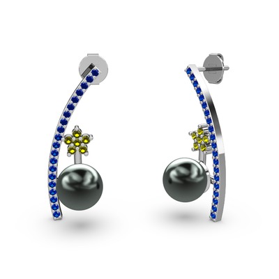 Siyah inci, lab safir ve peridot 8 ayar beyaz altın küpe
