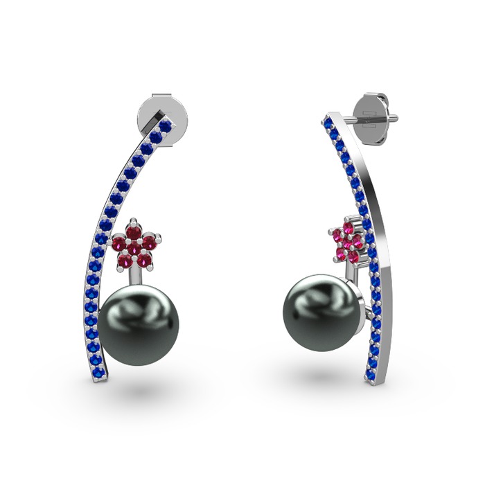 Siyah inci, lab safir ve rodolit garnet 925 ayar gümüş küpe