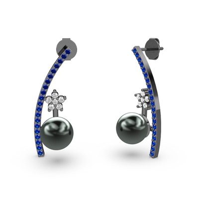 Siyah inci, lab safir ve swarovski 925 ayar siyah rodyum kaplama gümüş küpe