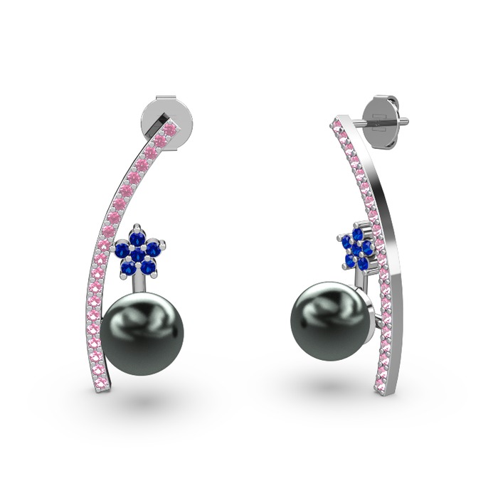 Siyah inci, pembe kuvars ve lab safir 8 ayar beyaz altın küpe