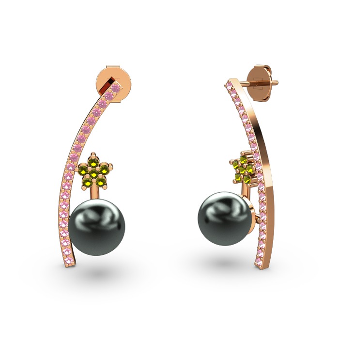 Siyah inci, pembe kuvars ve peridot 18 ayar rose altın küpe