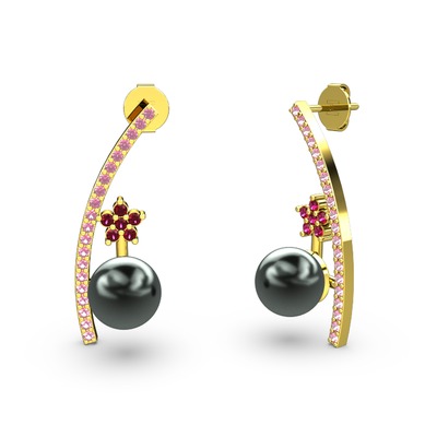 Siyah inci, pembe kuvars ve rodolit garnet 14 ayar altın küpe