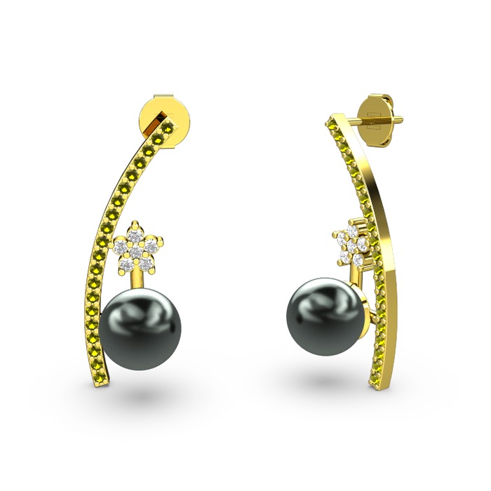 Siyah inci, peridot ve beyaz zirkon 8 ayar altın küpe
