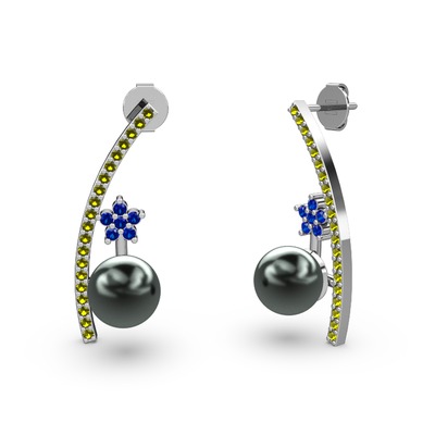 Siyah inci, peridot ve lab safir 8 ayar beyaz altın küpe