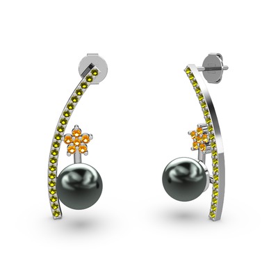 Siyah inci, peridot ve sitrin 18 ayar beyaz altın küpe