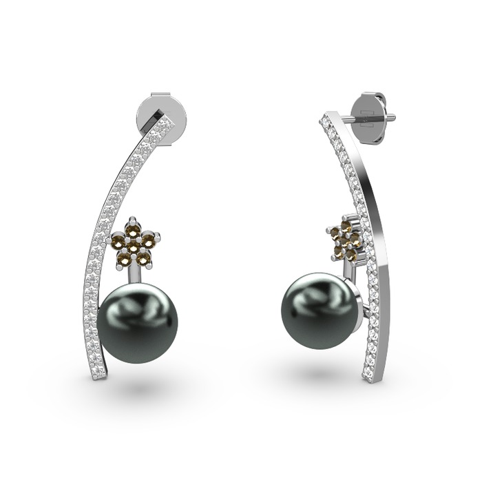 Siyah inci, pırlanta ve dumanlı kuvars 925 ayar gümüş küpe (0.18 karat)