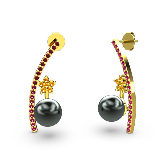 Siyah inci, rodolit garnet ve sitrin 14 ayar altın küpe