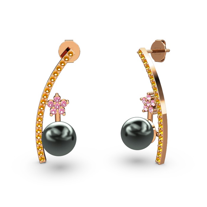 Siyah inci, sitrin ve pembe kuvars 14 ayar rose altın küpe