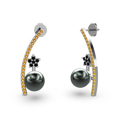Siyah inci, sitrin ve siyah zirkon 8 ayar beyaz altın küpe