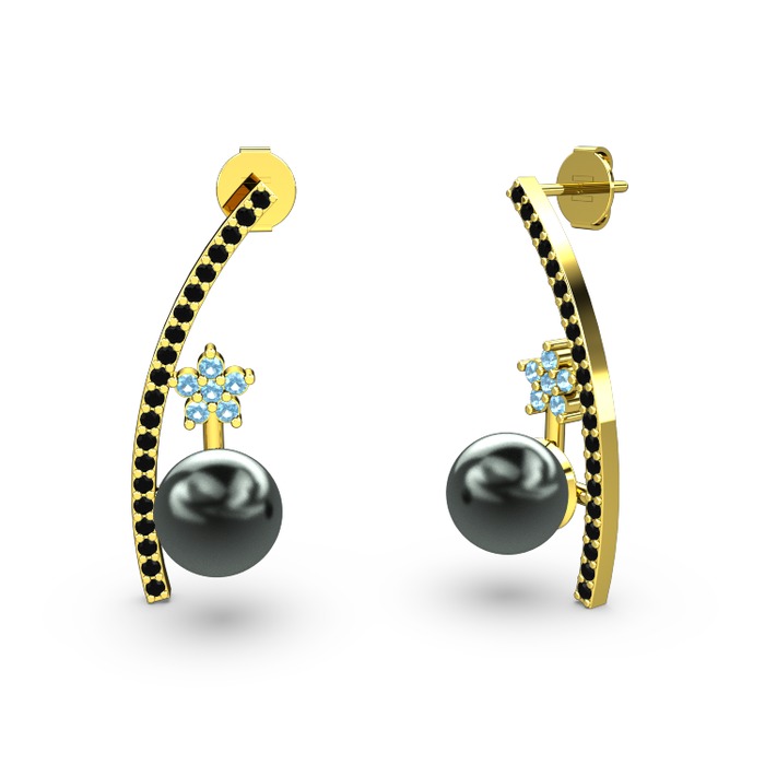 Siyah inci, siyah zirkon ve akuamarin 925 ayar altın kaplama gümüş küpe
