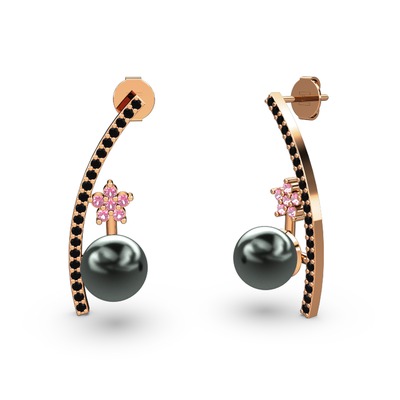 Siyah inci, siyah zirkon ve pembe kuvars 8 ayar rose altın küpe