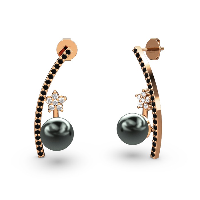 Siyah inci, siyah zirkon ve pırlanta 925 ayar rose altın kaplama gümüş küpe (0.44 karat)