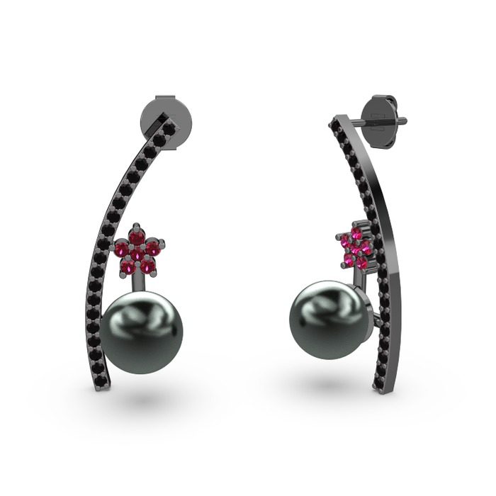 Siyah inci, siyah zirkon ve rodolit garnet 925 ayar siyah rodyum kaplama gümüş küpe