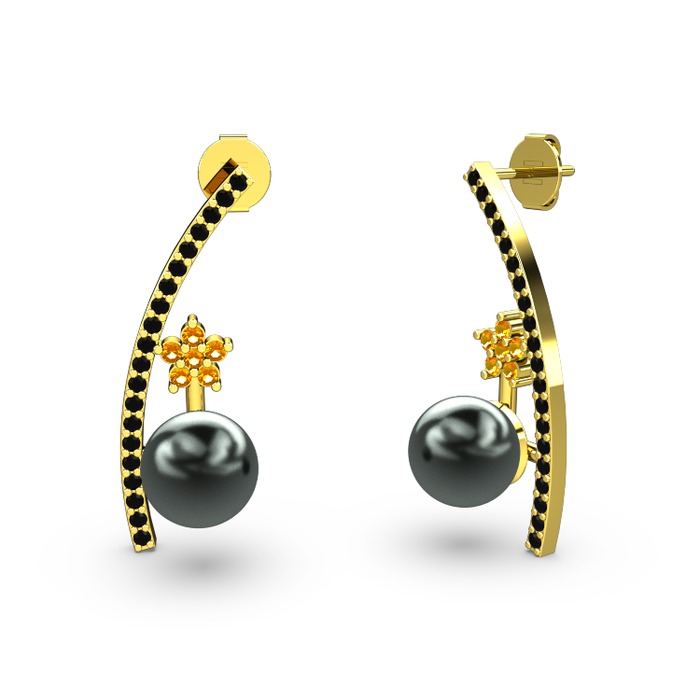 Siyah inci, siyah zirkon ve sitrin 925 ayar altın kaplama gümüş küpe