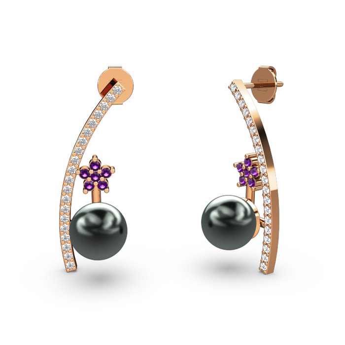 Siyah inci, swarovski ve ametist 18 ayar rose altın küpe