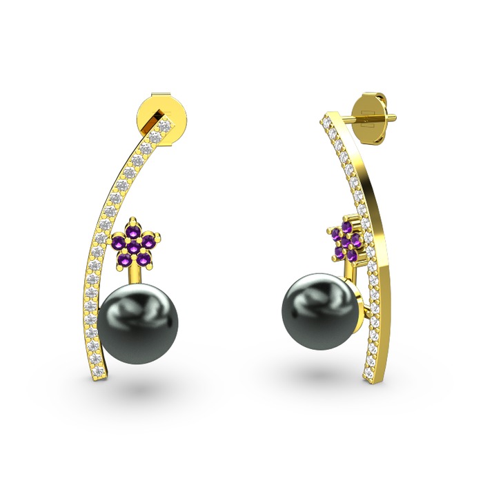 Siyah inci, swarovski ve ametist 925 ayar altın kaplama gümüş küpe