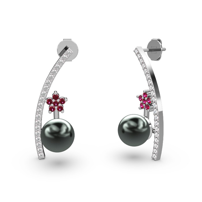 Siyah inci, swarovski ve rodolit garnet 925 ayar gümüş küpe