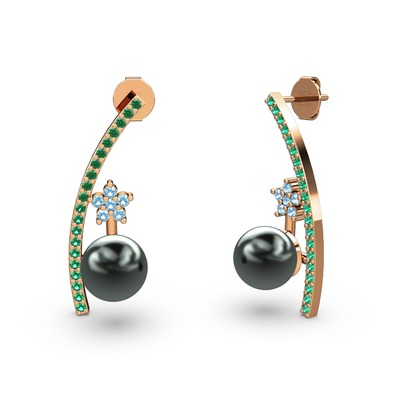 Siyah inci, yeşil kuvars ve akuamarin 8 ayar rose altın küpe