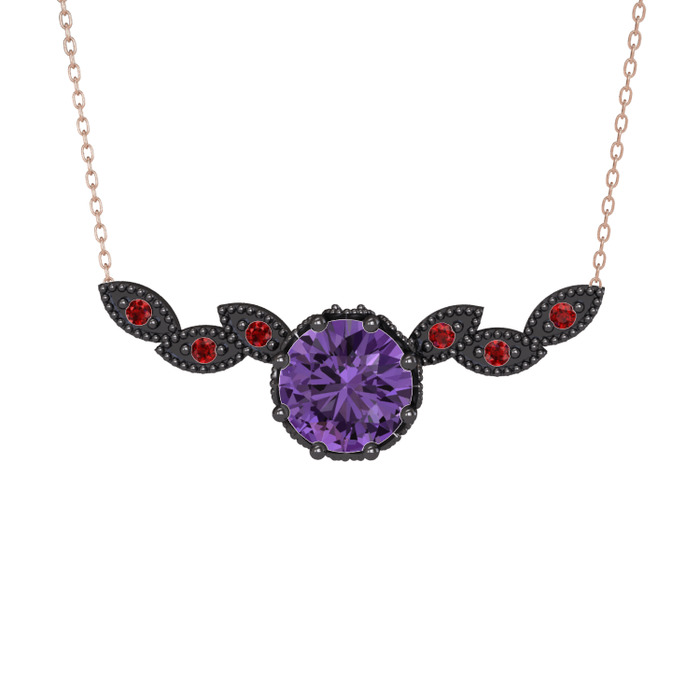 Ametist ve garnet 925 ayar siyah rodyum kaplama gümüş kolye (40 cm gümüş rolo zincir)