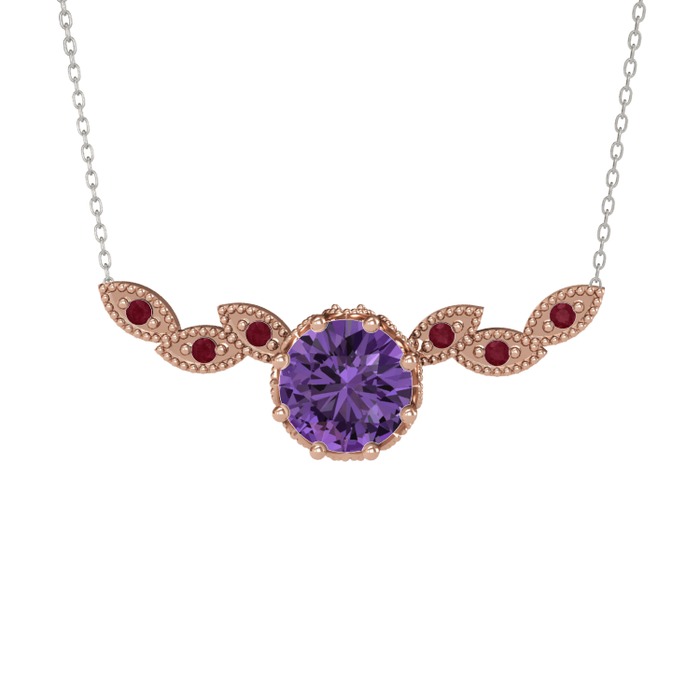 Ametist ve kök yakut 925 ayar rose altın kaplama gümüş kolye (40 cm beyaz altın rolo zincir)