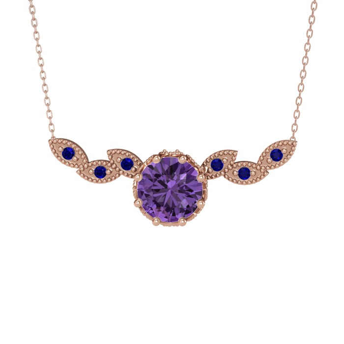 Ametist ve lab safir 8 ayar rose altın kolye (40 cm rose altın rolo zincir)