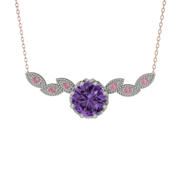 Ametist ve pembe kuvars 14 ayar beyaz altın kolye (40 cm gümüş rolo zincir)