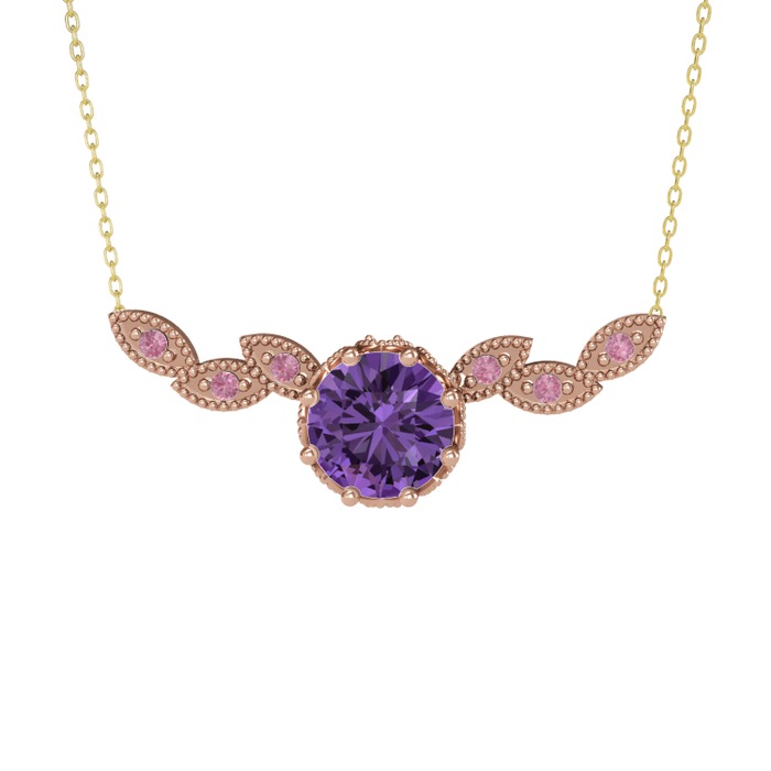 Ametist ve pembe kuvars 8 ayar rose altın kolye (40 cm gümüş rolo zincir)
