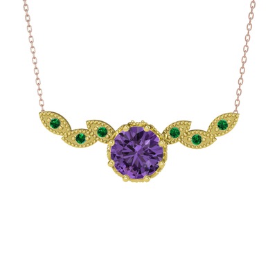 Ametist ve yeşil kuvars 14 ayar altın kolye (40 cm rose altın rolo zincir)