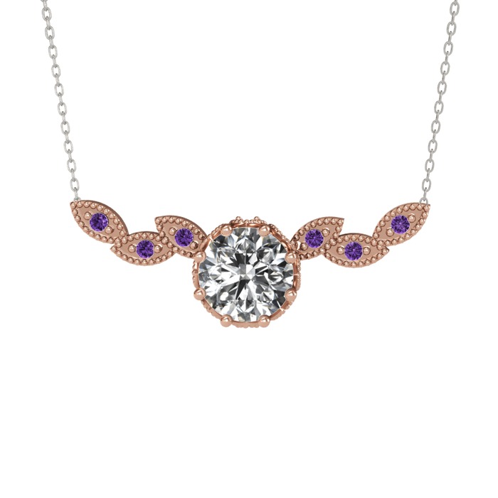 Beyaz zirkon ve ametist 925 ayar rose altın kaplama gümüş kolye (40 cm beyaz altın rolo zincir)