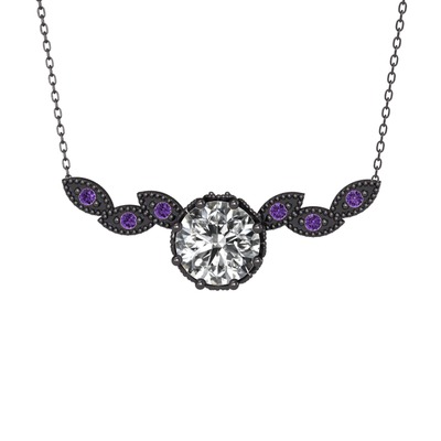 Beyaz zirkon ve ametist 925 ayar siyah rodyum kaplama gümüş kolye (40 cm gümüş rolo zincir)