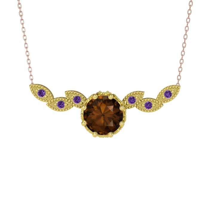 Dumanlı kuvars ve ametist 14 ayar altın kolye (40 cm rose altın rolo zincir)