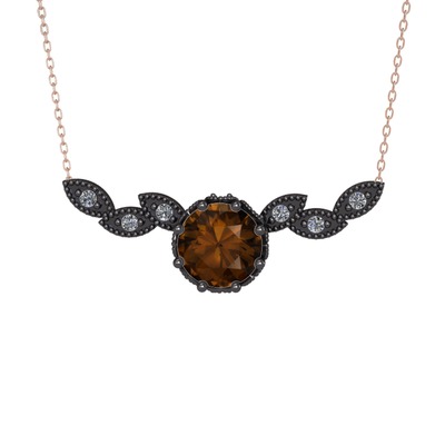 Dumanlı kuvars ve pırlanta 925 ayar siyah rodyum kaplama gümüş kolye (0.12 karat, 40 cm rose altın rolo zincir)