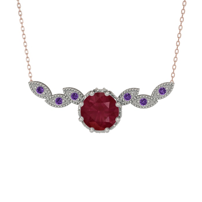 Kök yakut ve ametist 14 ayar beyaz altın kolye (40 cm rose altın rolo zincir)