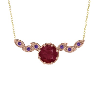 Kök yakut ve ametist 925 ayar rose altın kaplama gümüş kolye (40 cm gümüş rolo zincir)