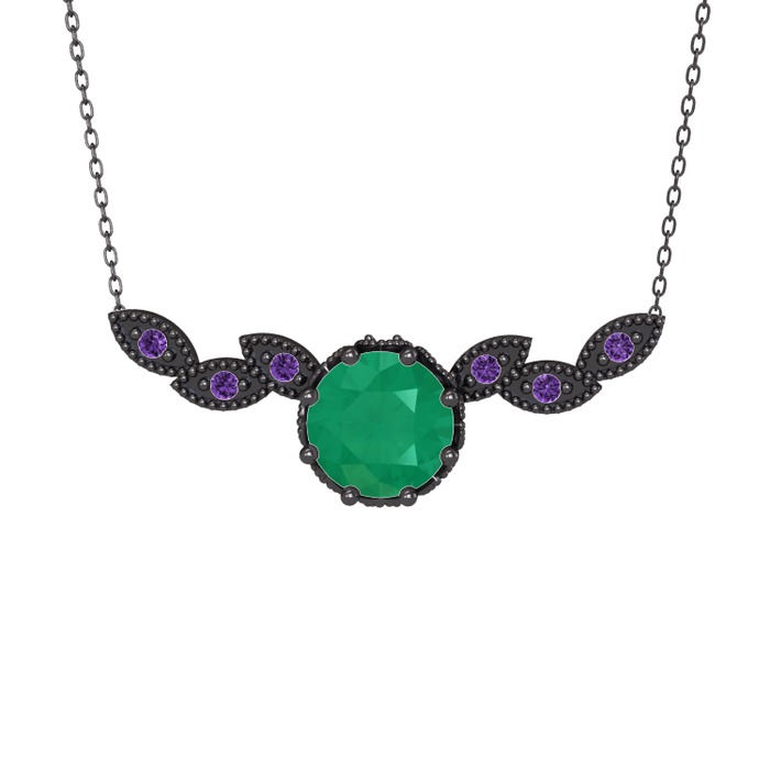Kök zümrüt ve ametist 925 ayar siyah rodyum kaplama gümüş kolye (40 cm gümüş rolo zincir)