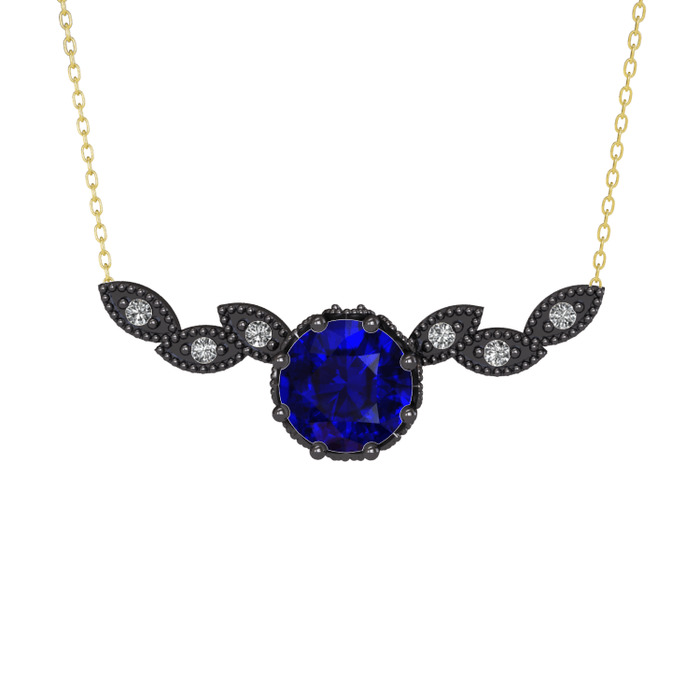 Lab safir ve beyaz zirkon 925 ayar siyah rodyum kaplama gümüş kolye (40 cm altın rolo zincir)