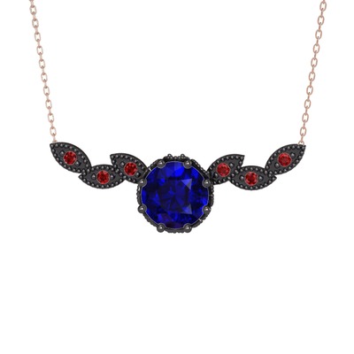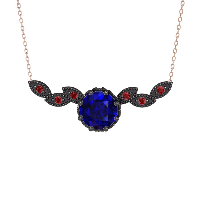 Lab safir ve garnet 925 ayar siyah rodyum kaplama gümüş kolye (40 cm rose altın rolo zincir)