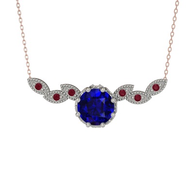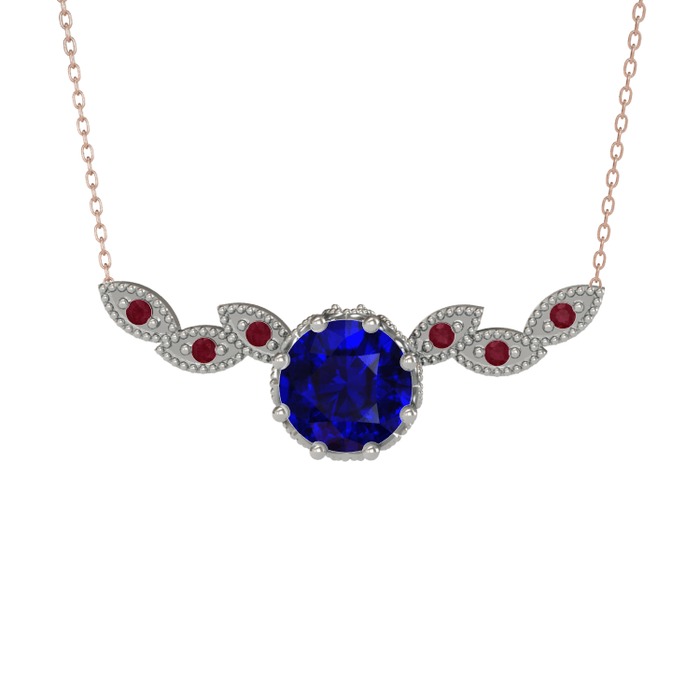 Lab safir ve kök yakut 14 ayar beyaz altın kolye (40 cm rose altın rolo zincir)