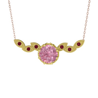 Pembe kuvars ve kök yakut 18 ayar altın kolye (40 cm rose altın rolo zincir)