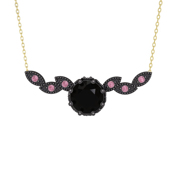Siyah zirkon ve pembe kuvars 925 ayar siyah rodyum kaplama gümüş kolye (40 cm altın rolo zincir)