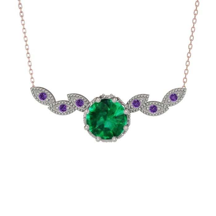 Yeşil kuvars ve ametist 8 ayar beyaz altın kolye (40 cm rose altın rolo zincir)