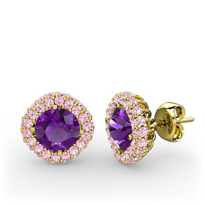 Ametist ve pembe kuvars 18 ayar altın küpe