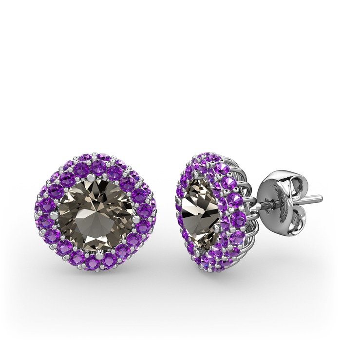 Dumanlı kuvars ve ametist 18 ayar beyaz altın küpe