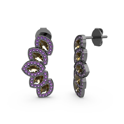 Ametist ve dumanlı kuvars 925 ayar siyah rodyum kaplama gümüş küpe
