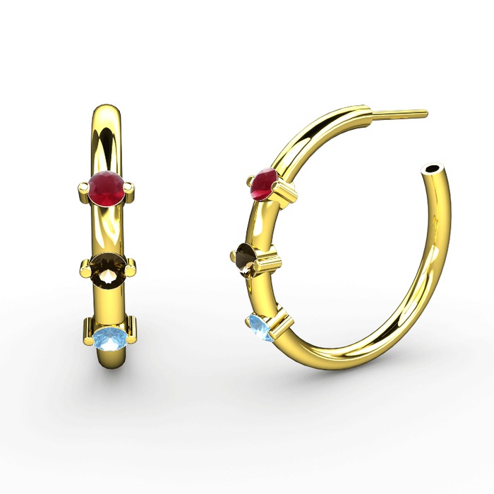 Akuamarin, dumanlı kuvars ve kök yakut 18 ayar altın küpe